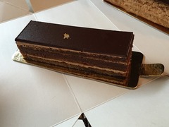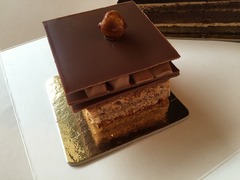 チョコレート感たっぷりのなめらかなクリーム、仕上げは薄い板チョコレート、生地の上のクッキー生地と共に食感を良くしている。