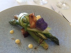 Asperges Vertes de Provence tièdes à l'Huile de Marjolaine, Poitrine de Porc Caramélisée au Miel de Sapin