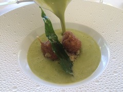 カリッと揚げたかえるのモモ肉とエンドウ豆のスープ、にんにくの香りと行者にんにくのチップス