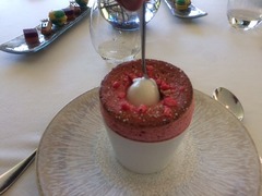 苺とプラリネローズのスフレ、ヨーグルト風味のソルベ