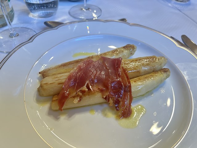 Asperges blanches des Landes, jambon cru Serrano et vinaigrette aux écorces
