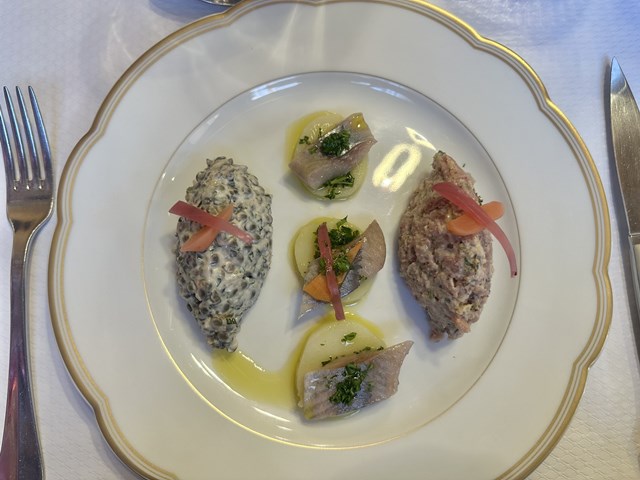 ポーチドエッグやベーコンの乗った定番のリヨン風サラダではなく、大きなボウルに入った5種類前後のサラダがテーブルに運ばれ、自分で好きなだけ取り分けて食べるスタイルの前菜ですが、今回はシェフのアレンジが加えられています。左側にはレンズ豆のサラダ。中央にはドレッシングでマリネされたじゃがいもの上に燻製されたニシン。右側にはmuseauミュゾーという豚の鼻や舌などの肉のサラダが綺麗に盛りつけられています。