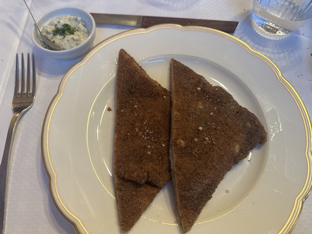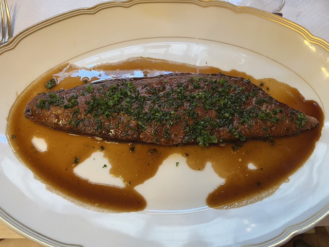 こちらも、リヨン名物!子牛のレバーの料理です。肉厚のレバーをさっとポワレします。この料理はステーキと同様に火通し加減を聞かれます。今回は、ジューシーに味わえるroséロゼ(中がピンク色で少し血が溜まっているような状態)で。仕上げにお酢を加えて酸味をプラスしており、ぷりぷりの食感とお酢の酸味が食欲をそそります。Tablier de sapeurと同様に、リヨンの内臓料理を代表する一品です。