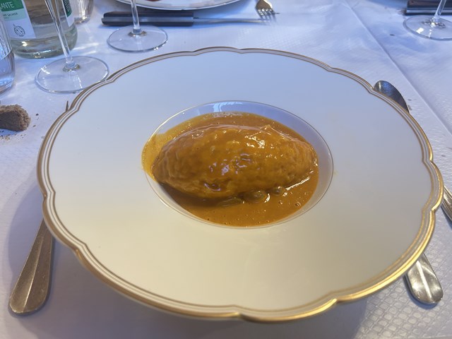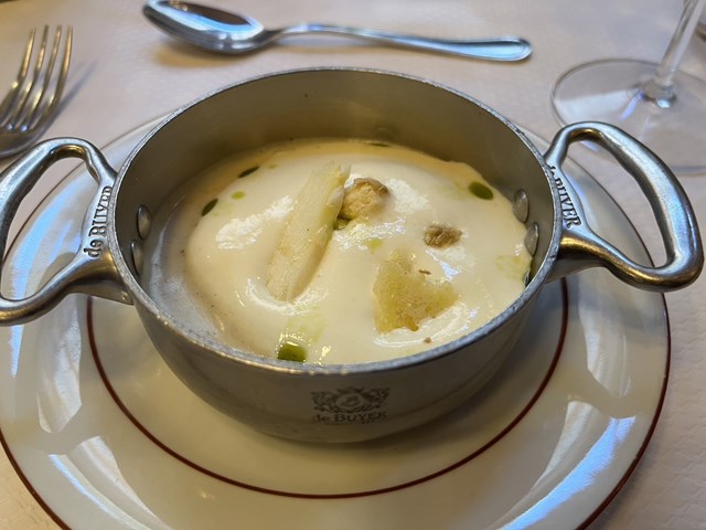 小鍋に盛りつけられたのは、じゃがいもの温かいポタージュで、中にはトロトロの半熟卵が隠されています。周りにはVacherin Fribourgeoisヴァシュラン・フリブルジョワという牛のミルクからできた、スイスのセミハードチーズの泡が添えられています。濃厚な卵とチーズのコクがとても相性が良かったです。
