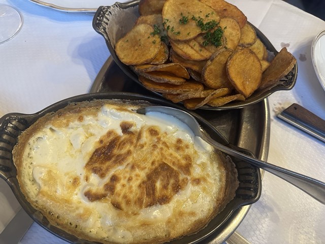 定番のつけ合わせの、鴨の脂で揚げたじゃがいも(写真上)と、マカロニのグラタン(写真下)です。すごい量になりました。。。もちろん1人ではなく4人で食べに行っていたので、協力して食べていきます。笑