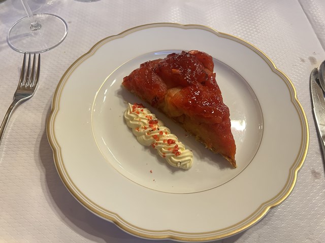 リンゴのタルトと、サヴォワ地方のSaint-Genixサン・ジュニという村で有名な赤く色づけたプラリンヌを組み合わせたデザートです。綺麗な赤色に色づいており、ほんのり温かい状態でした。ほのかな酸味とプラリネの香ばしさがとても相性が良かったです。このSaint-Genixのプラリンヌはお店のブティックでも販売されています。