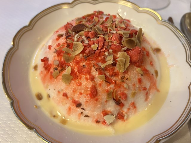 メレンゲを半球状にして、バニラソースに浮かべたデザートです。今回は、先ほどと同じくプラリンヌ・ルージュで風味をプラスしています。イル・フロッタントとは、"浮かぶ島"という意味があり、火を通したメレンゲなので比較的軽く食べられます。