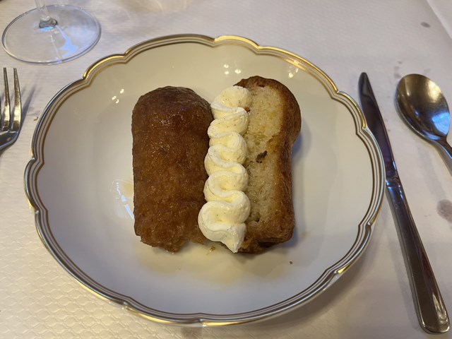ワインのコルクの形に焼き上げたブリオッシュ生地にたっぷりとラム酒風味のシロップを染み込ませ、中央にバニラクリームが絞られています。仕上げにラム酒をかけてもらう、パンチの効いたデザートです。お口直しも兼ねて、料理をたくさん食べた後にはどうしても食べたくなるデザートです。