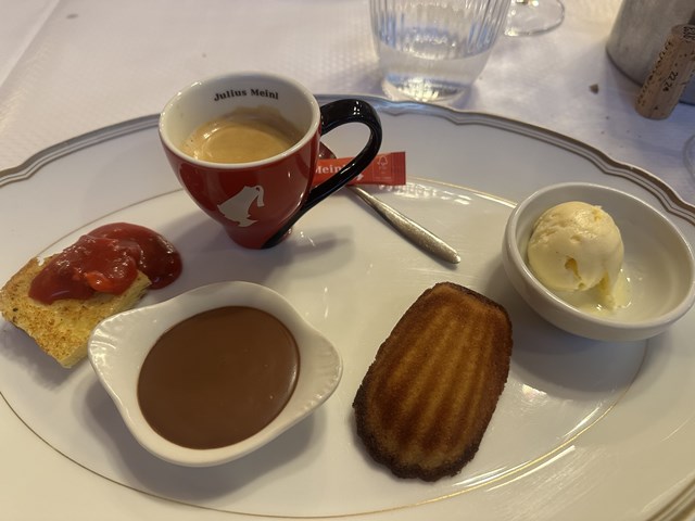 カフェ・グルマンとは、エスプレッソ・コーヒーに小さなデザートを数種類添えた"デザートセット"のようなものです。フランスのカジュアルなレストランではよく見かけるメニューになります。今回は、注文していなかったデザートの中から「La brioche façon pain perdu aux praline」と「Pot au chocolat valrhona」の小さいものと、マドレーヌ、バニラ風味のアイスクリームでした。