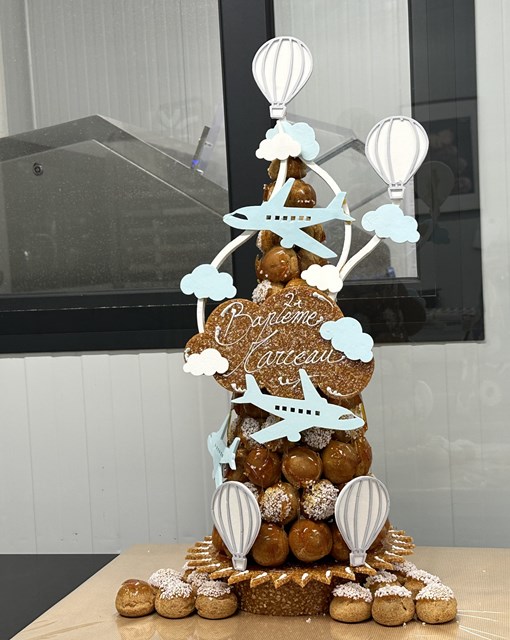 2020年にはお店の近くに新しいアトリエも完成。そのアトリエはとても広くて作業がしやすそうです。こちらのお店では、ピエス・モンテと呼ばれる大型のケーキの注文も受け付けています。シェフにラボの場所を聞いて伺うと、ちょうど小さなシューをキャラメルで接着し円錐形に積み上げるクロカンブッシュを作成していました。フランスでは結婚式、洗礼式などのお祝いの時に注文することが多いようです。