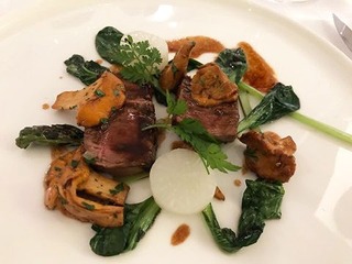 付け合わせにはジロール、カブ、チンゲン菜が盛られており、ソースは赤ワインベースで、濃厚でお肉に合っていました。
