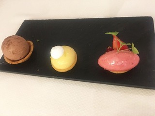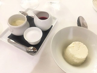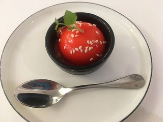 フランボワーズのムースの上には、パンナコッタの球体が盛られており、フランボワーズの酸味で良い口直しになりました。