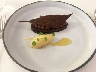 ショコラのサブレの間には、濃厚なガナッシュを挟み、洋梨のソルベ、洋梨のソースにトンカが加えられており、独特の風味を醸し出していました。