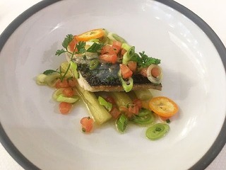 マクロ(サバ)の皮目はしっかり焼かれており、身はしっとりジューシーで、ソースはフレッシュのトマト、下には甘く炊かれたリュバーブが敷かれており、マクロの油脂分もソースがあることで和らげられており、リュバーブの甘さが良いアクセントとなっていました。