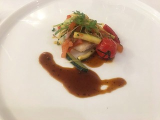 サンピエール(マトウダイ)の上には、ズッキーニやミニトマトなどの野菜のソテー、ソースは子牛でとったものに香辛料とタプナードを加えており、濃厚なソースと魚がとてもマッチングしていました。