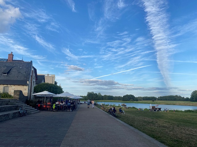 写真からも伝わるように、快晴でさわやかな風が吹き、とても気持ちのいい天気で、店の周りにもピクニックをしている人や夏の午後をゆっくりと過ごしている人々で賑わっていました。ブシュメーヌはアンジェというメーヌ・エ・ロワール県の県庁所在地に隣接し、そのあたりの気候はdouceur angevine(アンジェの甘さ)と呼ばれ、夏は晴れの日が多く、穏やかな気候なのが特徴です。