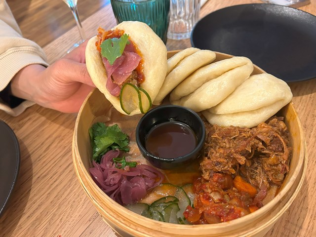 台湾発祥の料理で、現地の屋台ではB級グルメとして人気の一品です。甘辛く煮込んでほぐした豚肉、キムチやきゅうりのピクルス、赤玉ねぎのスライスや香菜など好きな具材を蒸しパンで挟み、豪快にいただきます!