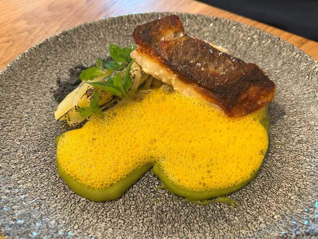 魚料理はその日の仕入れによって変わり、今日はスズキをポワレしたものでした。ソースはにんじんのエキュームに黒レモン(ライムを天日乾燥させて作ったもので、パウダー状にして使用する中近東のスパイス)の香りをつけたもの。つけ合わせはフヌイユの蒸し煮です。