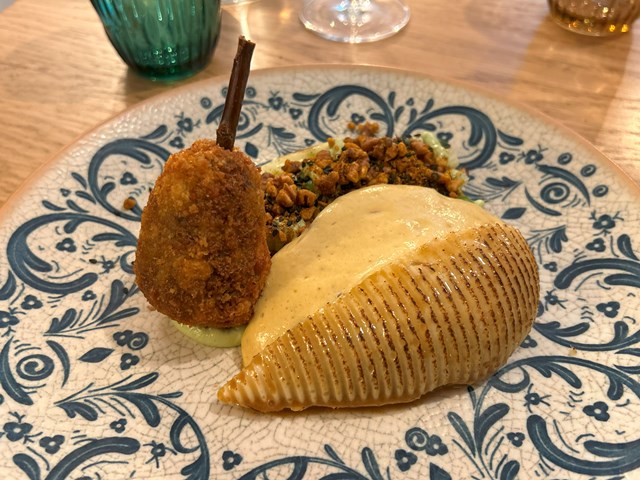 契約農家のダルさんのところで飼育された鶏肉を使った一品です。鶏肉のムースの中には、胸肉とたっぷりのマッシュルームが層になっています。コロッケに仕立てたもも肉、ソースは鶏ガラを煮出して作ったものにヴァン・ジョーヌ(フランス東部で作られる黄ワイン)や味噌が加えてある独特な味のものでした。横にスパイスが添えてあるのですが、『毛沢東スパイス』などと呼ばれ中国の湖南省の料理です。唐辛子や中国山椒、胡椒といった辛味やシビレのスパイスにフライドガーリックやフライドオニオン、ナッツ類が混ぜられている混合スパイスです。