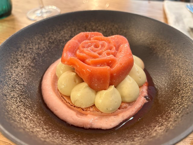 シャーベット、マカロン、ムースにそれぞれイチゴが使われており、旬を感じる春らしいデザートでした。クレーム・ディプロマットやバラの香りをつけたシロップも添えられています。