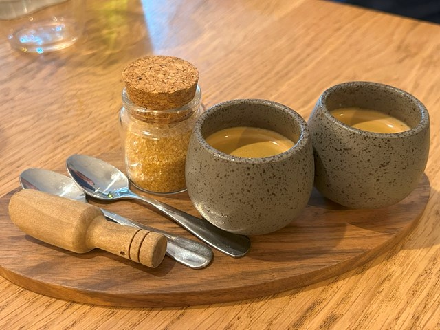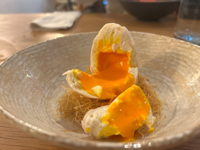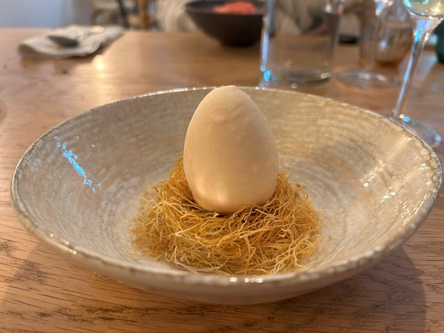 卵が大好きな私が注文したのはもちろんこのデザートです。卵? と思って中を割るとトロトロの黄身が流れ出てきましたーーー!白身の部分はアーモンド風味のガナッシュ、黄身の部分はバニラ風味のクリームにウコンで色をつけたもの。卵の下にはカダイフ(小麦粉で作った極細の麺)やアーモンドのプラリネが敷いてあり、まるで鳥の巣のようです。