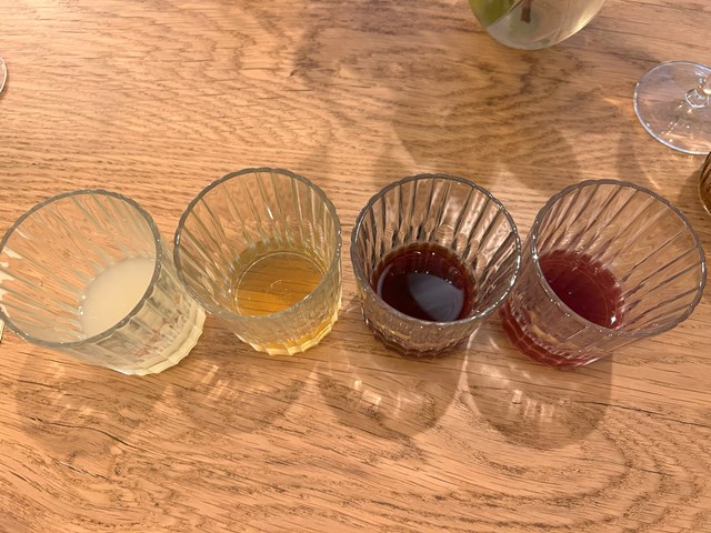 写真左から、『柚子酒』、『すっぱい梅酒』、『クルミのワイン』(クルミを浸け込んだ蒸留酒)、『ラタフィア』(ぶどうから作る蒸留酒)の4種を注文しました。ペリゴール特産品のクルミを使った食前酒やこの地方で作られるお酒の他、日本のお酒などもありました。