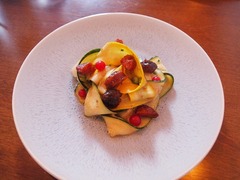 まずはアントレ。2種類のズッキーニを薄くスライスし、カリカリに焼いたチョリソ、グロゼイユの酸味がアクセントになっています。