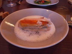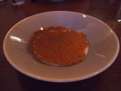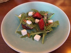 もう1品アントレ。鰯をさっと焼いて、羊のチーズとルッコラのサラダ、更にスイカが入っています。スイカが入っているのは意外性がありますが、甘味の控えめなものを使用していて、鰯との相性も良かったです。鰯は香ばしく、煮干にも似ていて懐かしい感じがしました。