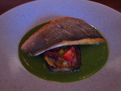 プラの1皿目は鯛がメインです。鯛の皮はパリッと中はふっくらと焼き、下には薄切りにして焼いたナスと生と乾燥の2種類のトマト。下にはパセリのソースがたっぷりと敷かれています。