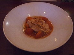 デセールもう1品は、今が旬のアプリコットをコンポートにし、ピーナッツのクリームとアクセントにプラランを振りかけています。