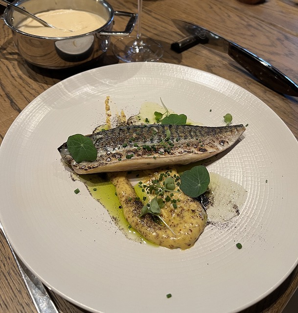 さばは半身を使用し、焼き目を綺麗につけジューシーに仕上げていました。つけ合わせは根セロリとりんごを使ったピュレです。オランデーズソースは、ブルゴーニュ産の老舗ファロ社の粒マスタードに柚子の酸味を効かせていました。