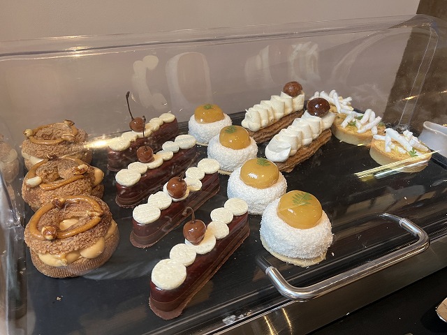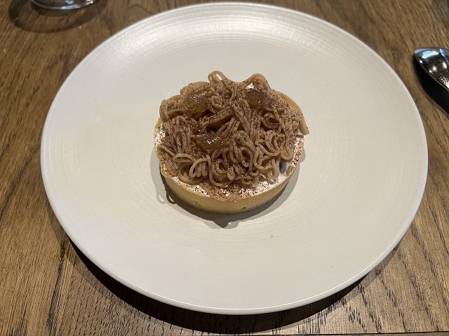 モンブランのタルトです。栗のペーストは甘味が控えめで栗の味をダイレクトに感じられるシンプルな味でした。中のクリームはマスカルポーネにバニラビーンズを加えたもので栗のペーストとも相性が良かったです。
