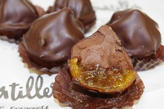クレマンティーヌのコンフィにガナッシュを絞り、チョコレートでトランペしてあります。