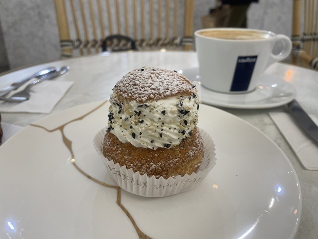 クッキー生地の乗ったシュー生地、濃厚なゴマのプラリネクリーム、生クリーム、仕上げにもゴマが使われています。