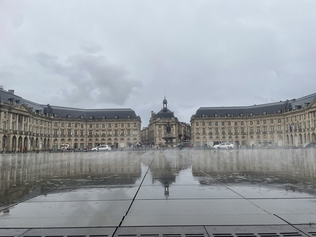 Miroir d'eau(ミロワール・ドー)は、薄い水の層に人や空、建物がまるで鏡のように反射します。水の鏡としては世界最大級で撮影人気スポットです。ちょうどミストが出ている時に遭遇できました!