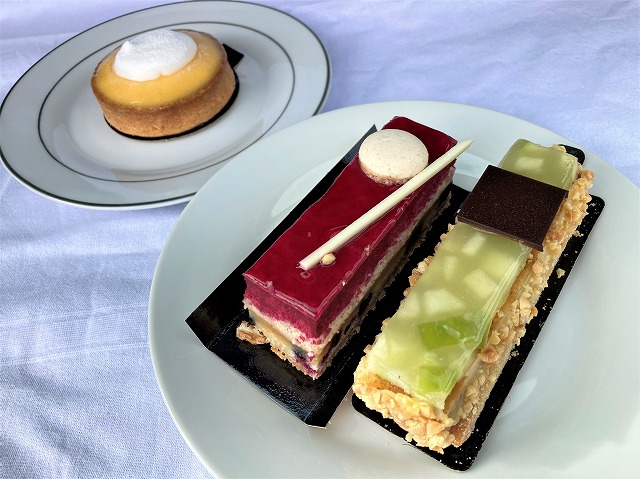 ホワイトチョコレートを使ったババロワの中に、カシスのジュレ、カシスとスミレの柔らかいクリーム、アーモンド風味のスポンジ生地で構成されています。フランスではスミレの花は砂糖漬けに加工しお菓子として楽しんだり、その香りを活かしてアメやチョコレートに加えたりと、幅広く親しまれています。表面のコーティングが淡い紫色で、ショーケースに並んでいても一段と存在感があるお菓子の1つでしたが、カシスの甘酸っぱい酸味にスミレの優しい香りが加わり、甘みが抑えられたとてもバランスの取れたお菓子でした。