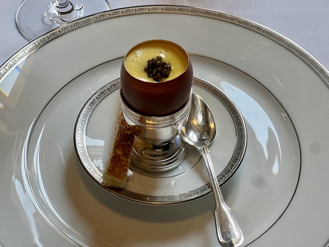 中にはとろっとした舌触りの卵黄と空気を含んでムース状になった卵黄に包まれたキャヴィアは甘味と塩味が程よく、ぷちぷちと口の中で弾けて卵黄ととても相性が良かったです。