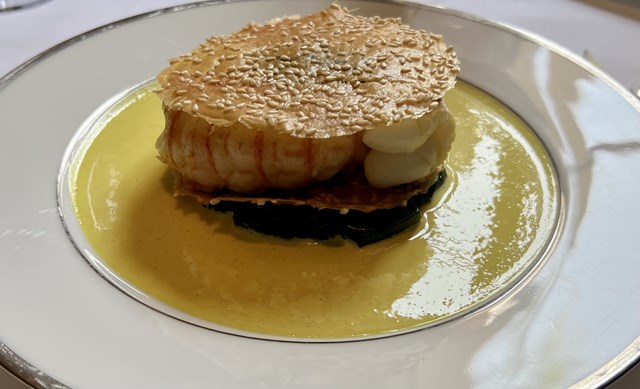 1品目はFeuillantine de langoustines aux graines de sésame, sauce au curry