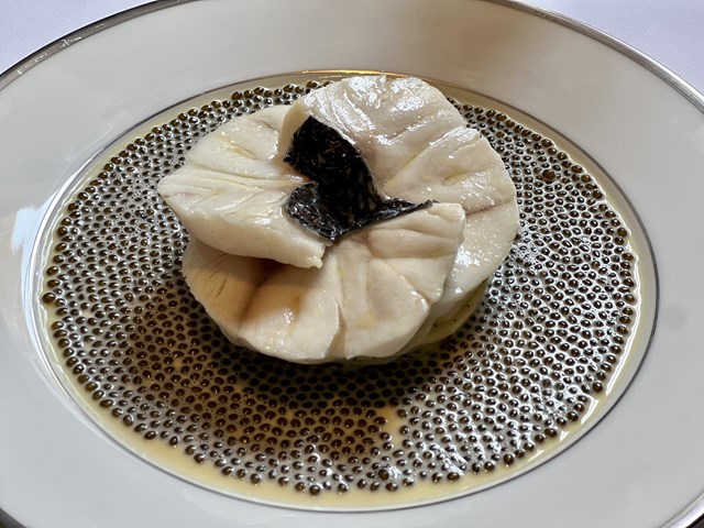 そしてお皿の端までたっぷり敷き詰められたキャヴィアソースは、ヴェルモット酒をベースにしたブール・ブランです。バターがたっぷり入ったソースですが、宝石のように敷き詰められたキャヴィアの塩味が丁度よくまとめていました。