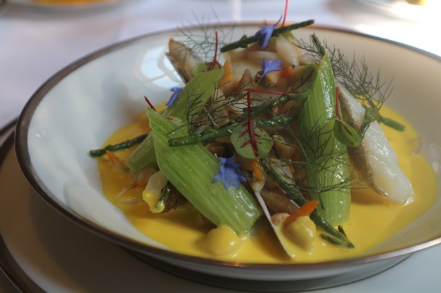 まずこの見た目の美しさに感動しました。虹色に光るスズキの火通しはプラックでの調節のみで、皮目も一切焦げ目のない仕上がりでした。こんなに美しく焼くテクニックはもちろん低温調理機ではなくシェフの腕と経験です。ランブロワジーの料理は現代で重宝されている調理機材は一切使いません。伝統的なプラック、直火、オーブンのみです。