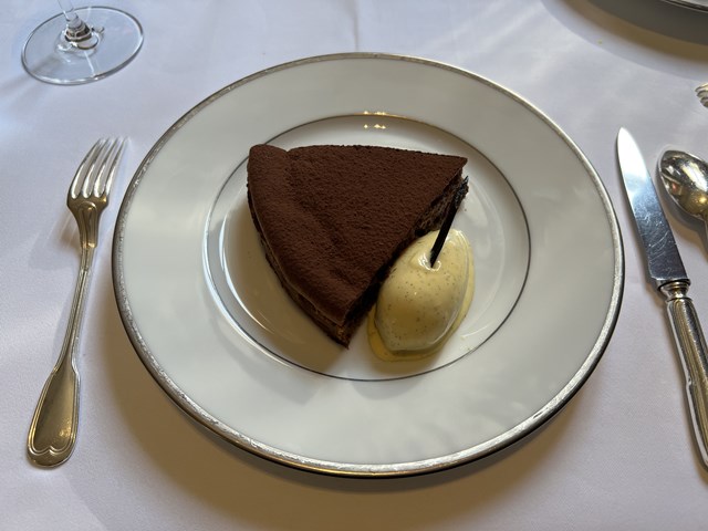 タルトと言っても外側の生地は薄く、カカオもビターな甘さで軽く泡のようになくなる儚いデザートでした。でも口の中にカカオの香りが長く続いて余韻も楽しめ、バニラアイスの濃厚な味もタルトとの温度差で食べやすかったです。大きなポーションでもペロっと食べてしまいました。