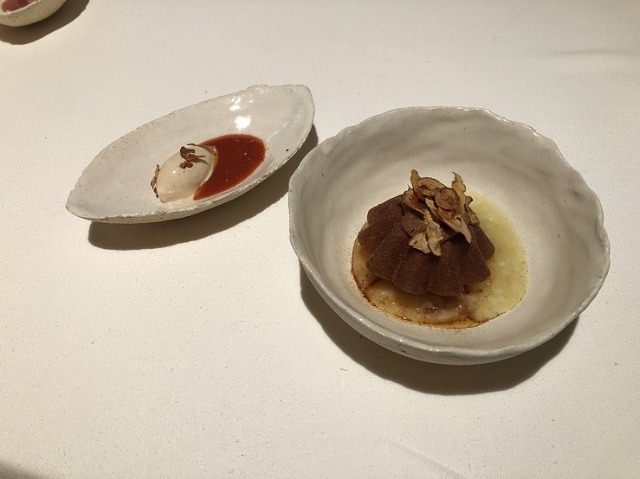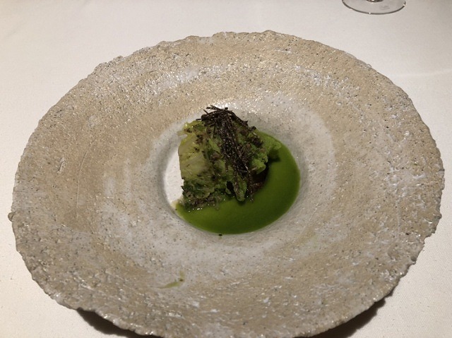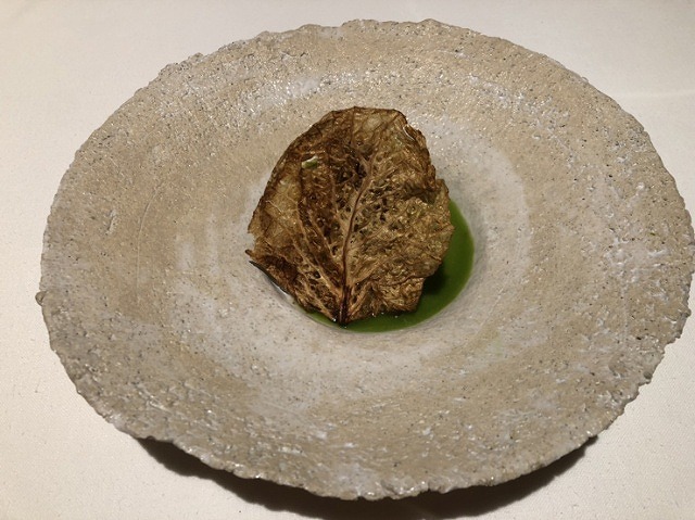 もう一つアルザス地方の郷土料理でシュー・クルートがあります。そちらを再構築した1品です。本来ならキャベツを発酵させたものと食肉加工品を煮込んだ料理ですが、今回は肉類を使用せずに仕上げられていました。ちりめんキャベツをブレゼして上にはトリュフの千切り、酸味を効かせた香草のソースを流します。全体を覆い隠すようにちりめんキャベツチップスを添えています。