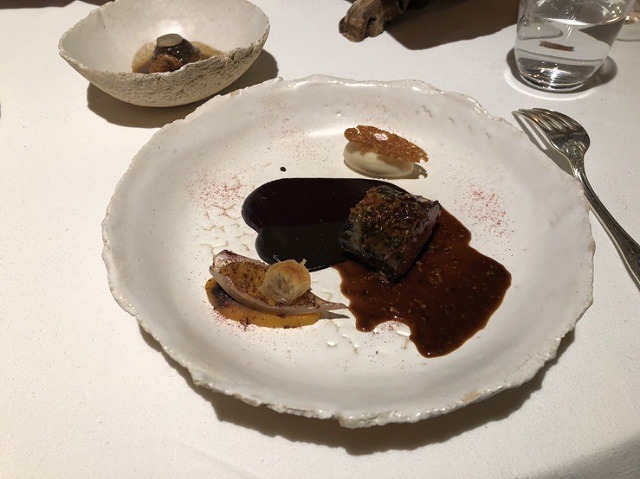 メイン料理は鹿ロースのロティ、上にはキノコを乾燥させて削ったものを添えています。つけ合わせにエシャロットのコンフィ、かぼちゃのピューレ、小玉ねぎのフリットを組み合わせたもの、じゃがいもとサワークリームのピューレとチーズのガレット、ブルーベリーの甘いピューレ、鹿の骨、切れ端のお肉をベースにしたジュ・ド・シュブルイユで仕上げにトリュフを加えたソースが盛りつけられています。別添えで肩肉の赤ワインのブレゼ、季節のキノコをソテーしたものが添えられています。鹿肉を噛み締めるとジューシーで旨味を感じられるような火通しで香り高いソースとの相性は抜群でした。