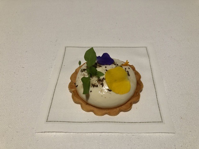 薄め生地をタルト型に焼成して上にはマンステールのエスプーマを絞っています。上には蜂蜜、クミンシード、花を散らしています。