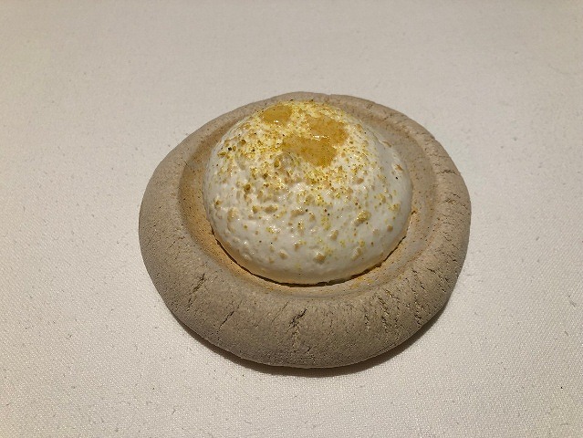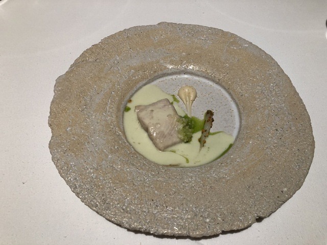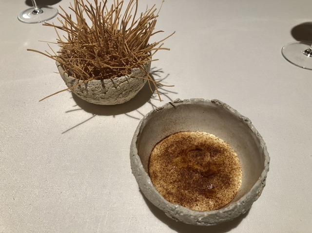 アルザス地方のフロマージュブランで作ったエスプーマ、中に炒めた玉ねぎ、ラルドンが入っています。生地は細い棒状にして焼き上げ、ディップしたり、ちぎって中に入れて一緒に食べたり出来ます。本来のタルトフランベより滑らかな口当たりで軽く仕上げられていました。