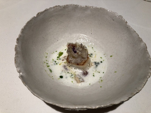 ポワレした帆立の下に季節のキノコのデュクセル、上にはタルタルが盛り付けられています。ソースには帆立の出汁をベースにしたクリームソース、香草のオイルを散らしています。西洋わさび(レフォール)をテーブルの目の前で削って提供されました。