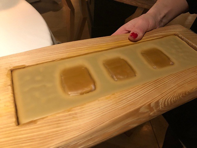 オンブル・シュヴァリエという川魚を1人前にカットし、スチームモードで火を通して皮を取り除きます。そして木製の型の中に入れて上から75℃に温めた蜜蝋をかけて7分間かけてゆっくりと火を通します。テーブルごとに目に前で演出をしていただきます。つけ合わせにはカブのブレゼ、アーモンドのピューレ、セロリとりんごのピクルス、ソースをヴァン・ジョーヌのソース・ヴァン・ブランでした。