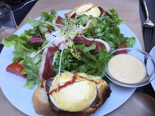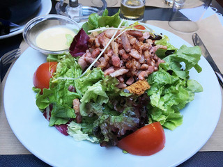 カリカリに焼いてあるベーコンの下には半熟のゆで卵、たっぷりのレタスやトレビス、トマト、マスタード風味のドレッシングで美味しく頂きました。