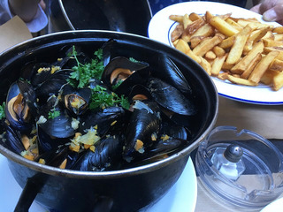 ムール貝をエシャロット、パセリ、白ワイン、バターなどで煮込んだものです。香味野菜の良い香りで貝類特有の生臭さも感じません、このお鍋いっぱいに入ったムール貝をフライドポテトと一緒に頂きます。