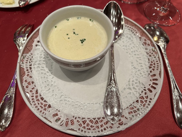 次にグリーンピースのポタージュ。ちょっと薄目かな?なんて思っていたら、中のフレッシュプティポワのパンチ力を引き立てている素晴しいバランス。